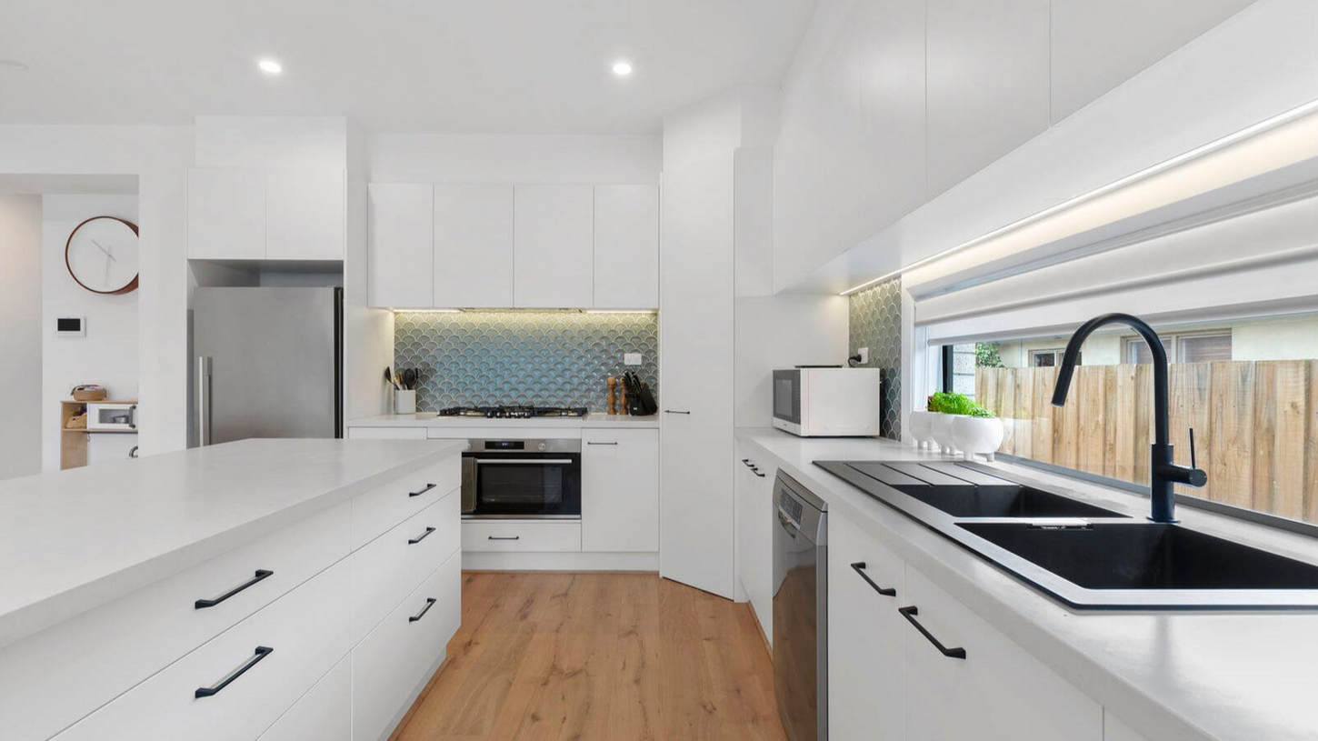 Appointed with a professional’s eye for detail with a streamlined window-splashback for the prestige Bosch appliance kitchen, and the latest tiered floor-to-ceiling tiling for the bathrooms and ensuite, the home’s interiors are high on impact. Styled with cool stone benchtops and warm French Oak floors amongst the bold black detail of tapware, hardware and sinks. There’s even an eye-catching semi-freestanding duo-tone bath.